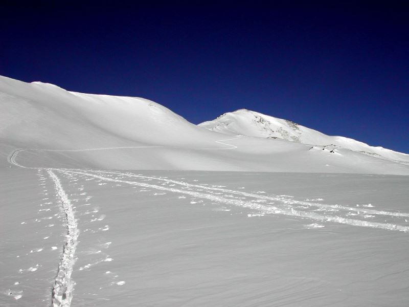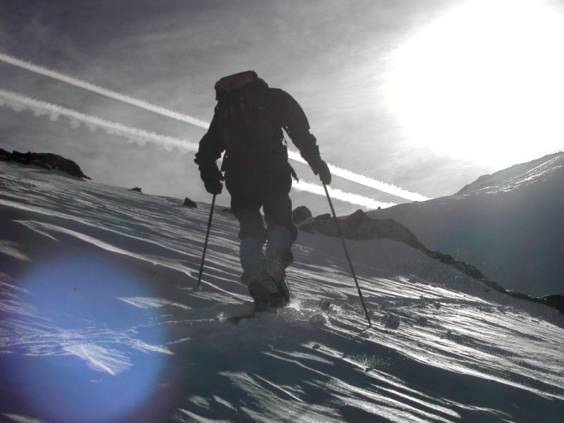 Schnee: unten Setzgeräusche, im Aufstieg oben verblasen/windgepresst, Abfahrt gesetzter Pulver