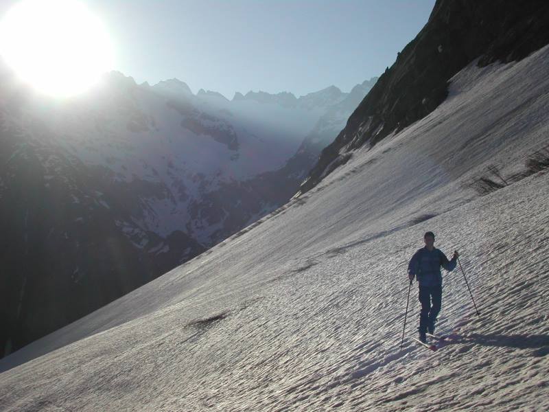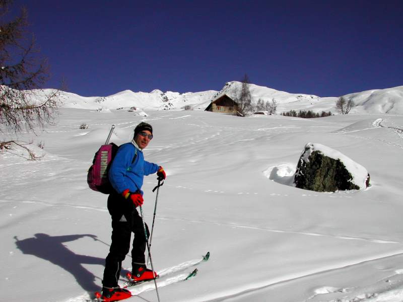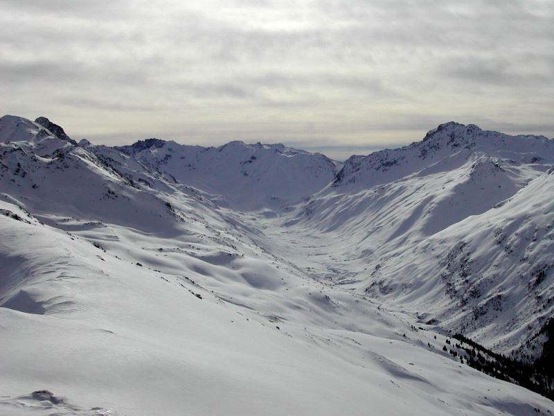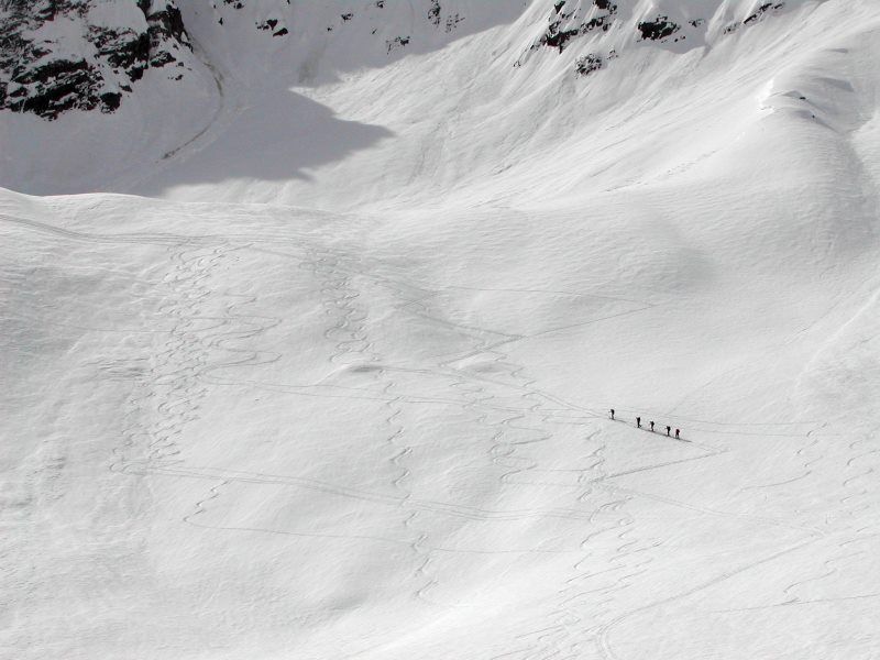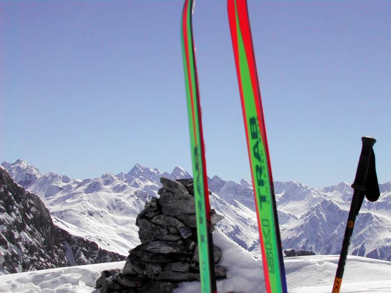 Schnee: Pulver (bei geschickter Routenwahl), unten Harsch, Bruchharsch, Firn