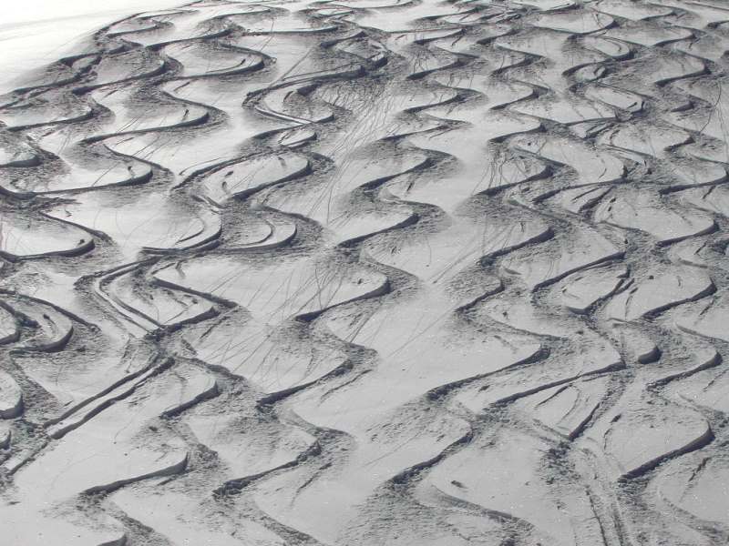 Schnee: unten Setzgeräusche, Pulver, oben verblasen/windgepresst