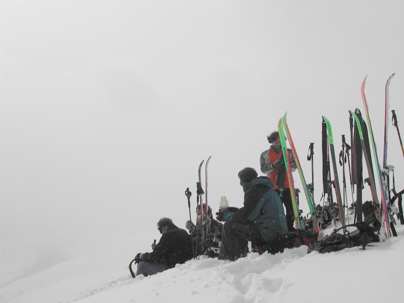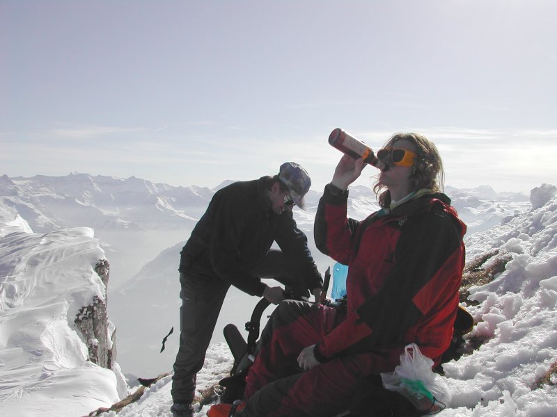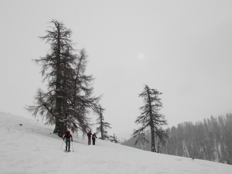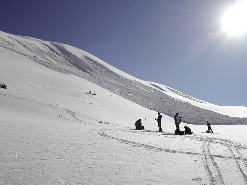 Schnee: Gipfelhang Harsch, dann schwerer Pulver, im Wald Sumpf