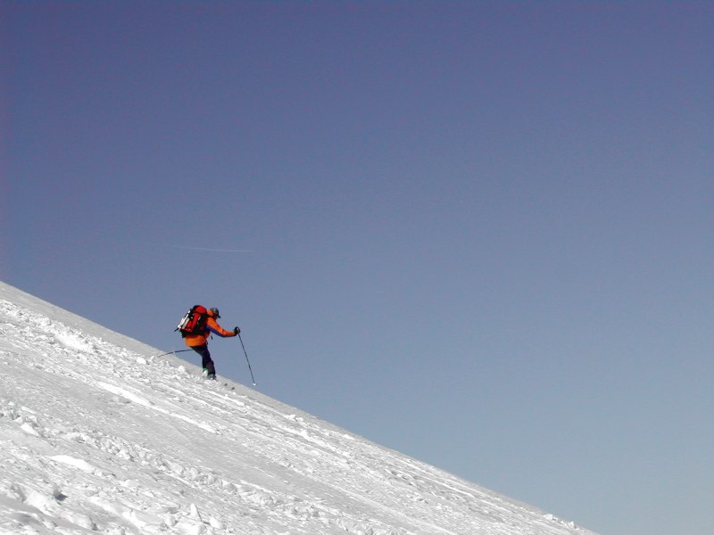 Schnee: an schattigen und windgeschützten Stellen Pulver, sonst Bruchharsch, ca. 20 Abfahrtsspuren