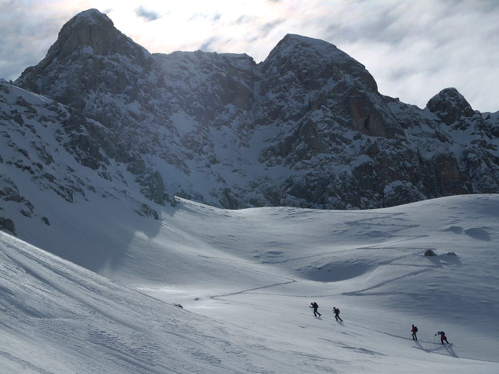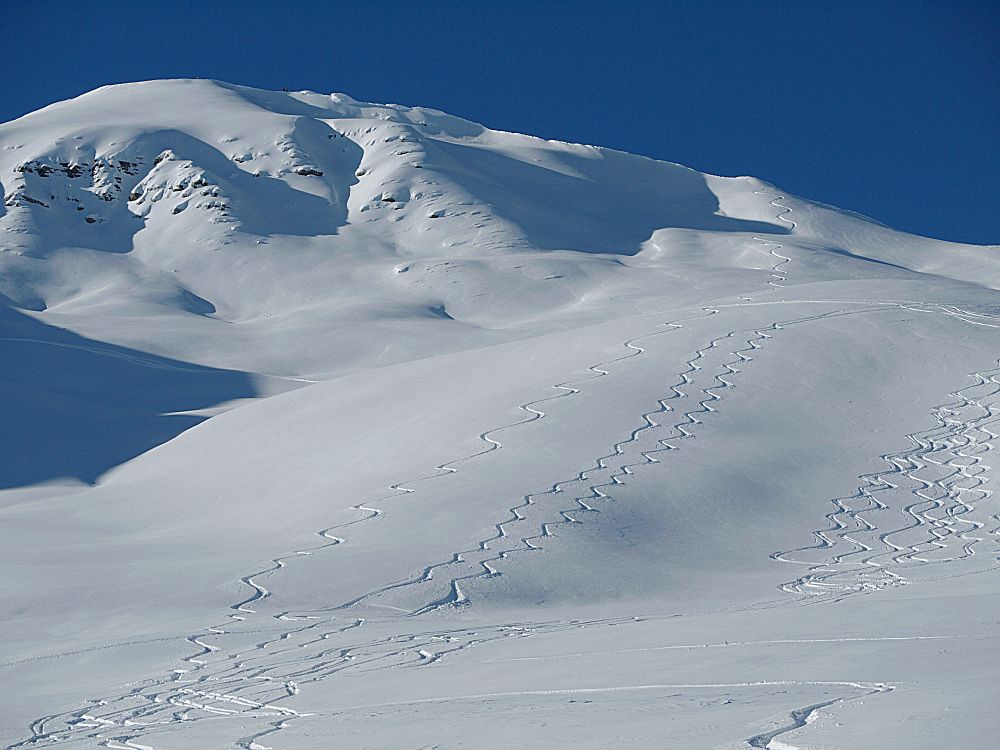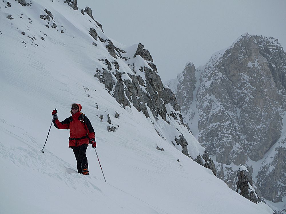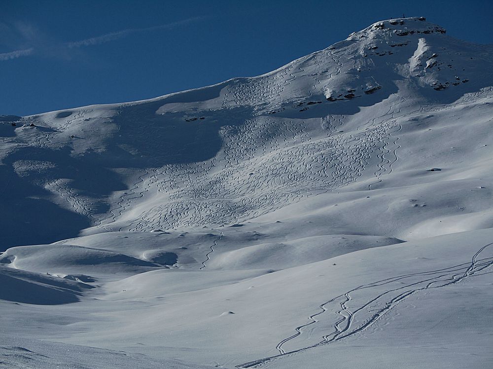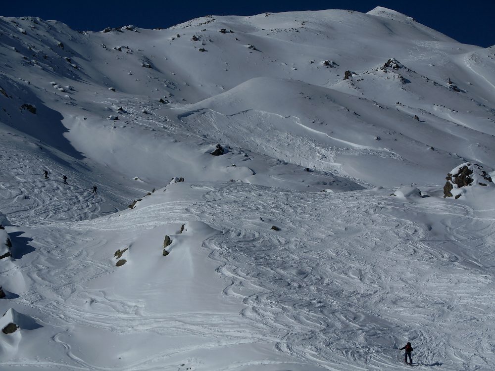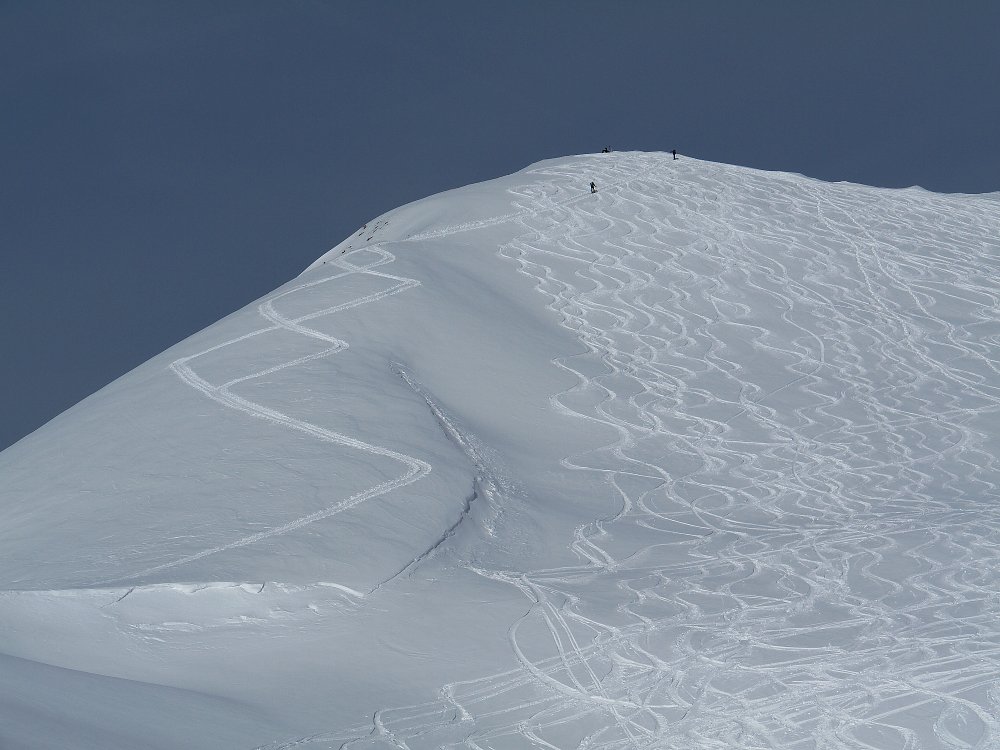 Schnee: schattseitig Pulver, sonst Bruchharsch/Harsch, viele Spuren