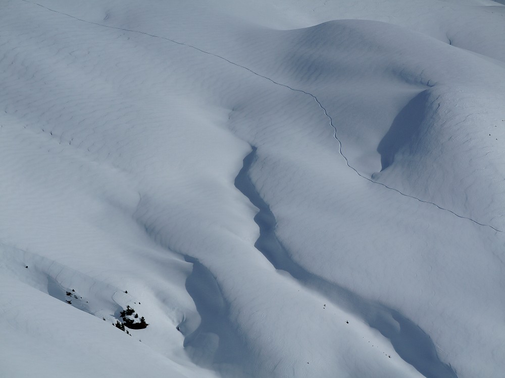 Schnee: schmale Tourenabfahrt, daneben Bruchharsch/Sumpf